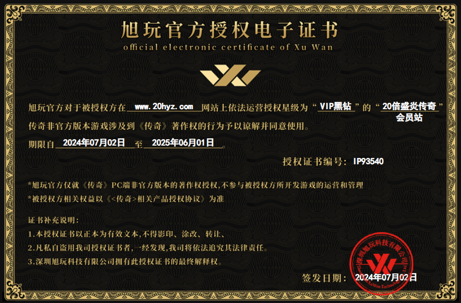 2022年12月长沙分公司成立-长沙赤月网络科技有限公司。20CQ会员站正式上线,站点均获得浙江旭玩传奇IP多版本授权。点击查看授权文件